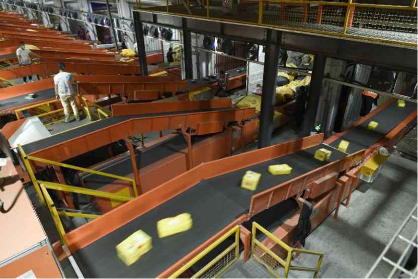 Several hundred workers are busy sorting packages at an express transfer station in Huai’an city, east China’s Jiangsu province, May 14, 2022. (People’s Daily Online/He Jinghua)