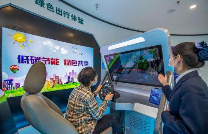 A citizen tries driving a virtual new energy vehicle at a smart energy experience center in Yuncheng city, north China’s Shanxi province, Feb. 24, 2021. (People’s Daily Online/Xue Jun)