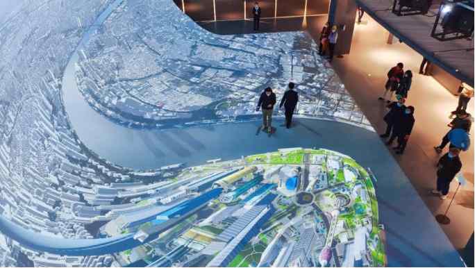 Citizens watch a 5D immersive digital sand table at the Shanghai Urban Planning Exhibition Center, Feb. 23, 2022. (People’s Daily Online/Chen Yuyu)