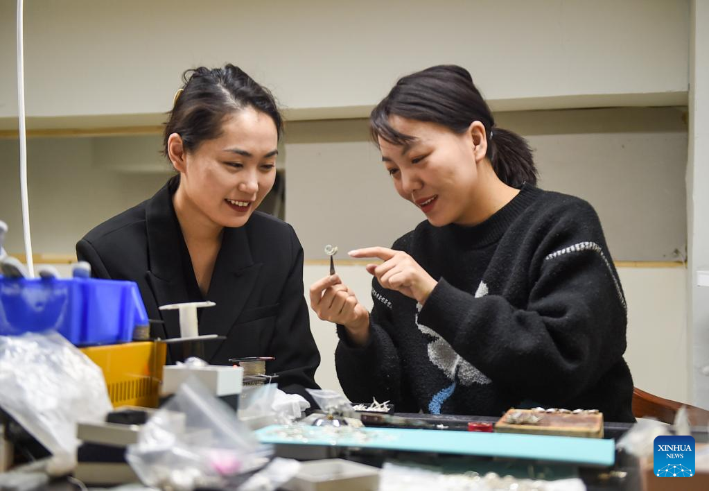 After graduation, Tergel and Zhang Aoyu chose to start up their own business, which has integrated fashionable elements into traditional silver accessory making. They sell their silver accessory products both online and offline, including the popular live-streaming sales, to have their products publicized and attract more young customers to be fascinated by their traditional silver accessories with modern elements. (Xinhua/Peng Yuan)