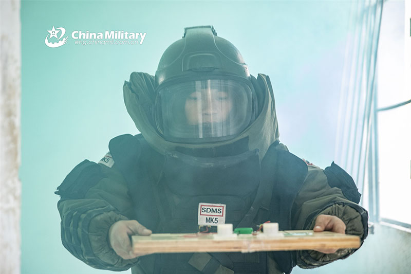 A fully-armed soldier assigned to a mobile detachment under the People's Armed Police (PAP) Guangxi Corps transfers a mock exploder to the designated area amid thick smog in an explosive ordnance disposal (EOD) training drill on February 18, 2022. (eng.chinamil.com.cn/Photo by Yu Haiyang)