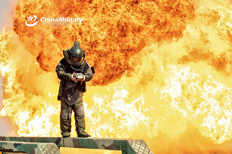 A fully-armed soldier assigned to a mobile detachment under the People's Armed Police (PAP) Guangxi Corps walks on the balance beam with a mock exploder amid the fire smoke in an explosive ordnance disposal (EOD) training drill on February 18, 2022. (eng.chinamil.com.cn/Photo by Yu Haiyang)