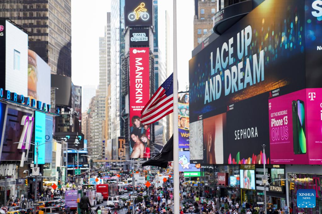 A U.S. flag is seen on Times Square in New York, the United States, May 17, 2022. (Xinhua/Wang Ying)