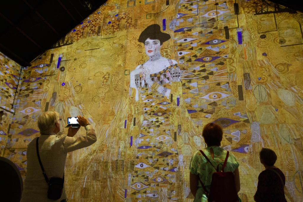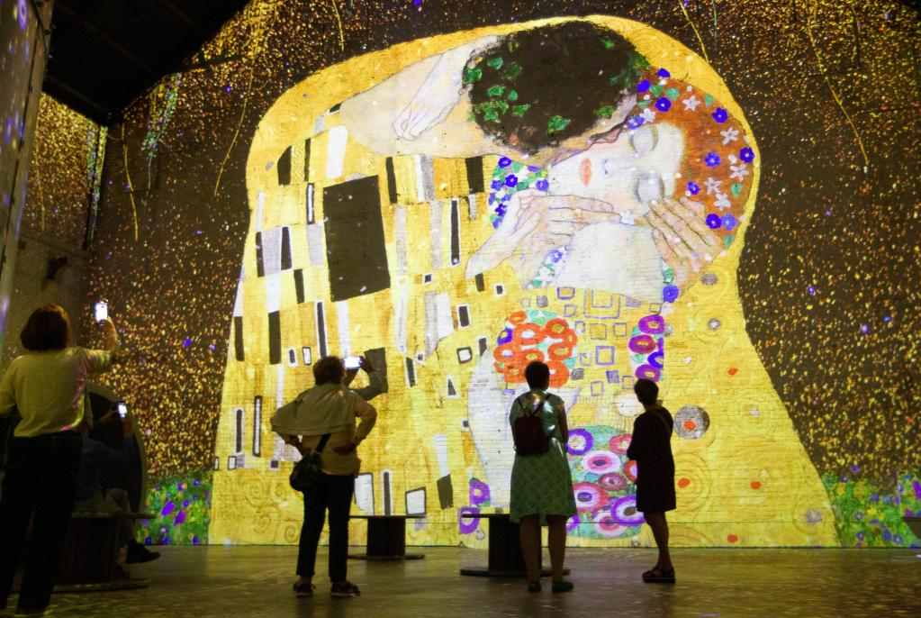 Visitors view digital artworks at an exhibition at Fabrique des Lumieres in Amsterdam, the Netherlands, on May 18, 2022. Using cutting-edge technology with light projections and music, Fabrique des Lumieres features immersive exhibitions of classical, modern and contemporary artists. The inaugural exhibition programs here include exhibitions presenting digitized artworks of renowned artists Gustav Klimt and Friedensreich Hundertwasser as well as contemporary creations "Journey" and "Memories." (Photo by Sylvia Lederer/Xinhua)