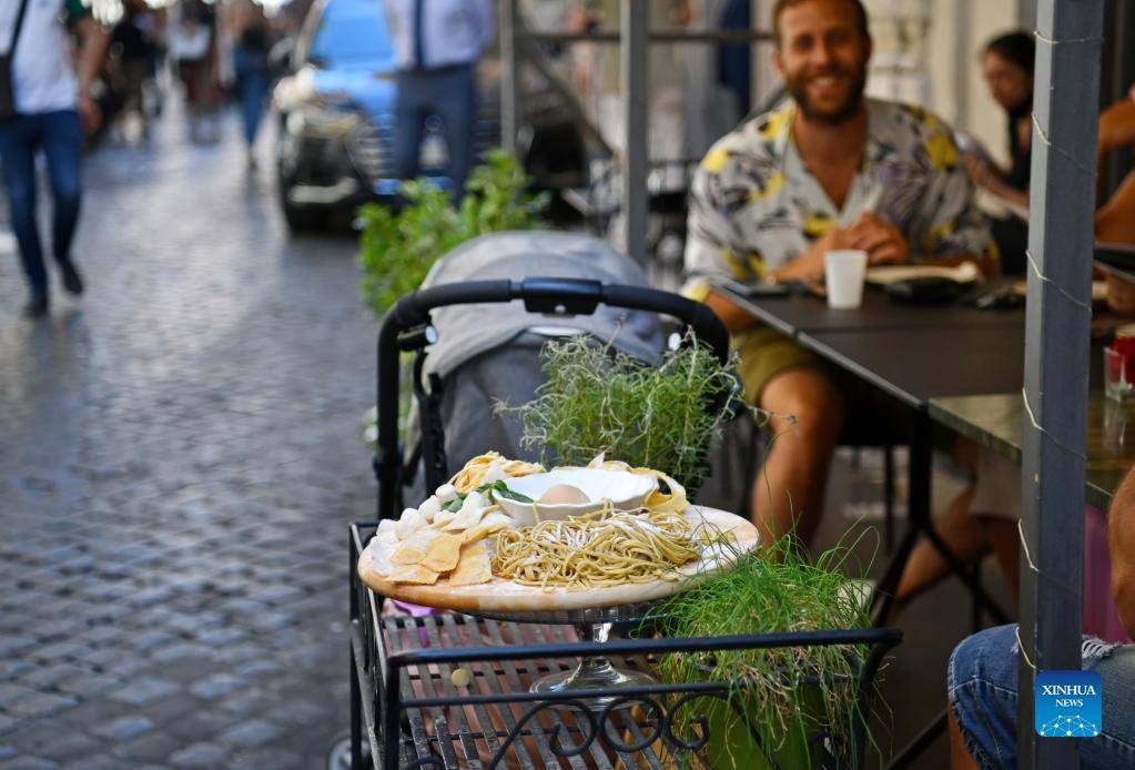Pasta models are seen at a restaurant in Rome, Italy, on May 19, 2022. Italy's most traditional meal -- pasta, which comes in many different forms -- has been getting more expensive in recent months, and indications are that the trend is set to continue. (Xinhua/Jin Mamengni)