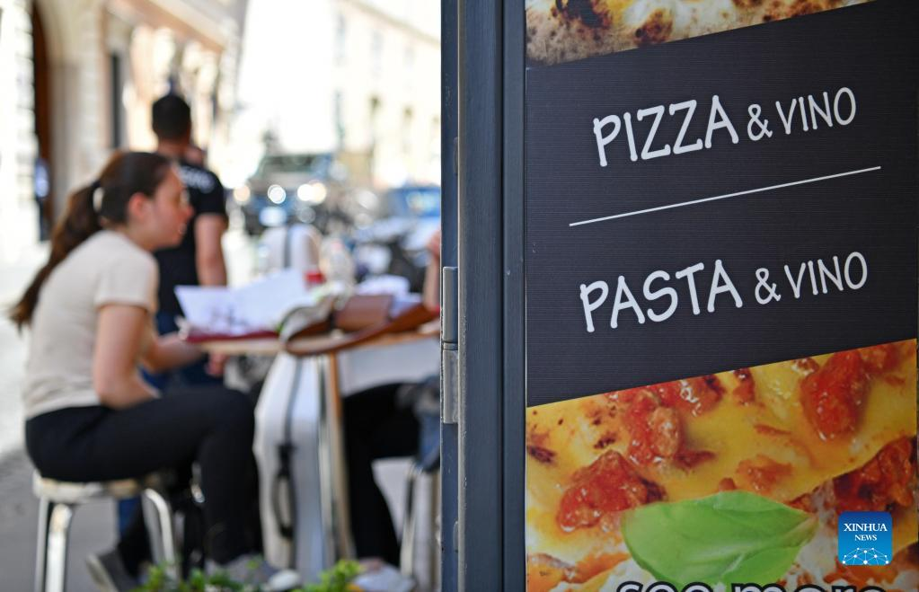 An advertising board of selling pasta is seen at a restaurant in Rome, Italy, on May 19, 2022. Italy's most traditional meal -- pasta, which comes in many different forms -- has been getting more expensive in recent months, and indications are that the trend is set to continue. (Xinhua/Jin Mamengni)