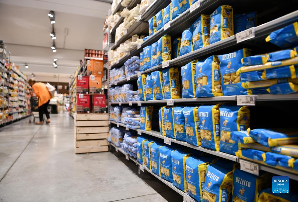 Pastas are seen for sale at a supermarket in Rome, Italy, on May 19, 2022. Italy's most traditional meal -- pasta, which comes in many different forms -- has been getting more expensive in recent months, and indications are that the trend is set to continue. (Xinhua/Jin Mamengni)