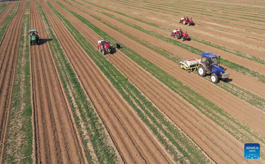Aerial photo taken on May 11, 2022 shows farmers operating machines to sow soybean seeds in Fanhe Township of Tieling, northeast China's Liaoning Province. Liaoning has stepped up efforts on farming activities as the temperature rises recently. By May 17, the province's spring sowing area of crops has reached 48,645,000 mu (3,243,000 hectares). (Xinhua/Yang Qing)