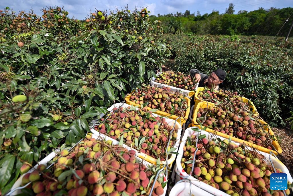 A farmer loads litchi at Dafeng Town in Chengmai County, south China's Hainan Province, May 19, 2022. Harvest season for litchi has come in Chengmai County. (Xinhua/Guo Cheng)