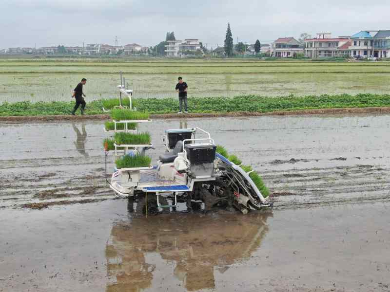An unmanned transplanter equipped with the BeiDou Navigation Satellite System (BDS) works in the fields of a new cooperative farm in Yumin village, Shizong township, Tongzhou district, Nantong city, east China’s Jiangsu province, July 2021. (People’s Daily Online/Xu Congjun)