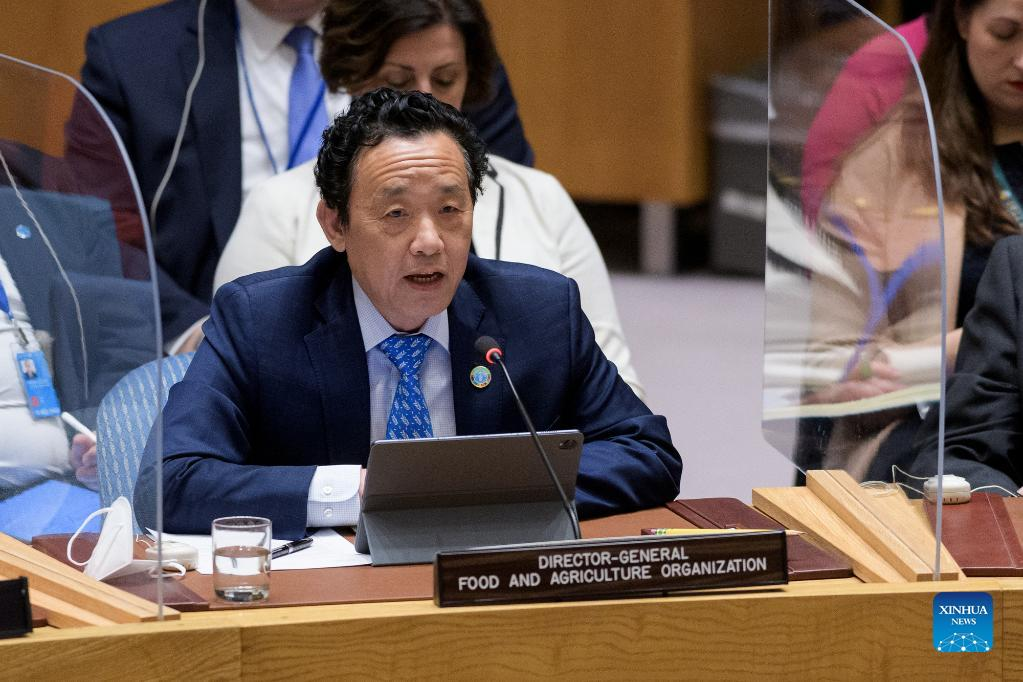 Qu Dongyu, director-general of the Food and Agriculture Organization, briefs the Security Council meeting on conflict and food security at the UN headquarters in New York, May 19, 2022. The UN Security Council met on Thursday to address food insecurity and called on the international community to strengthen cooperation to solve it. (Eskinder Debebe/UN Photo/Handout via Xinhua)