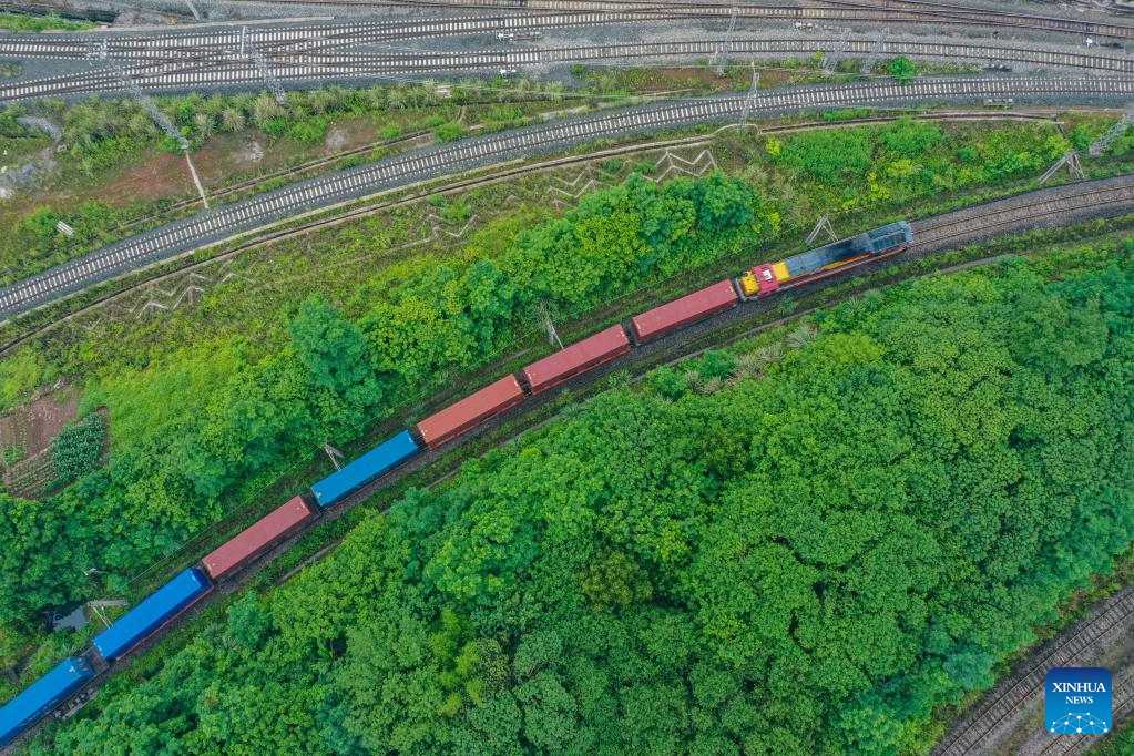 Aerial photo taken on May 21, 2022 shows a China-Laos cargo train departing from a station in southwest China's Chongqing Municipality. A cargo train carrying local foods and agricultural machines departed from a station in southwest China's Chongqing Municipality for Laos' capital Vientiane on Saturday, marking the launch of the first China-Laos cargo train that enjoys a favorable quick entry and export channel.