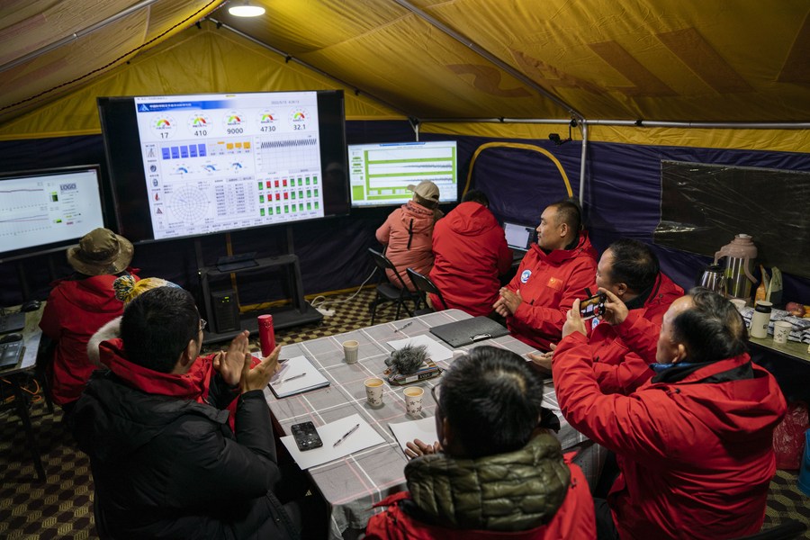 Members of a Chinese scientific expedition team conduct scientific research on Mount Qomolangma on May 4, 2022. (Xinhua/Sonam Dorje)