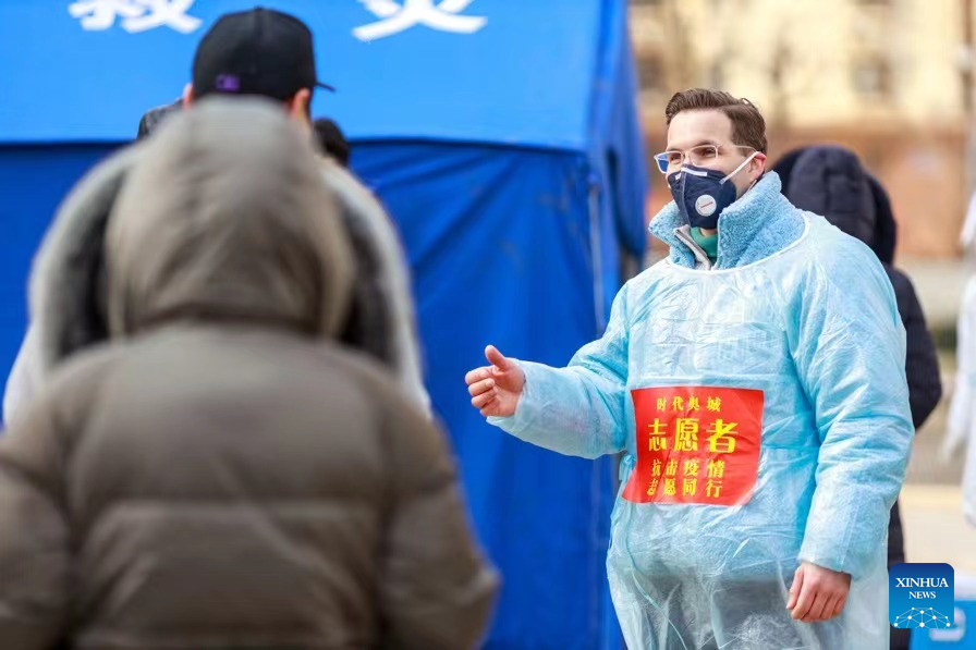 Photo taken in January of 2022 shows Iarroumets Jonathan guiding residents to receive nucleic acid tests at a community in Nankai District, north China's Tianjin.