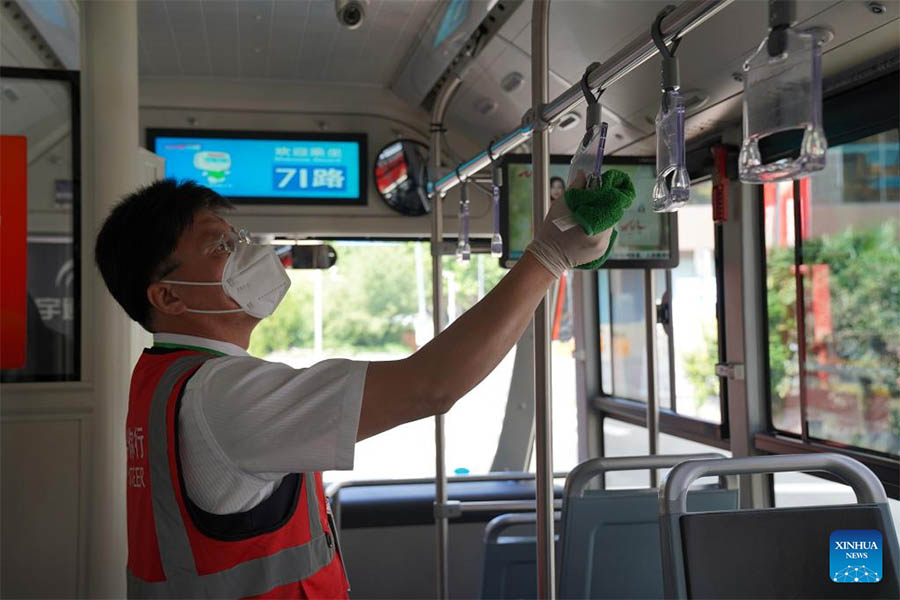 A staff member disinfects the handles on a bus in Shanghai, east China, May 22, 2022. (Xinhua/Wang Chenyang)