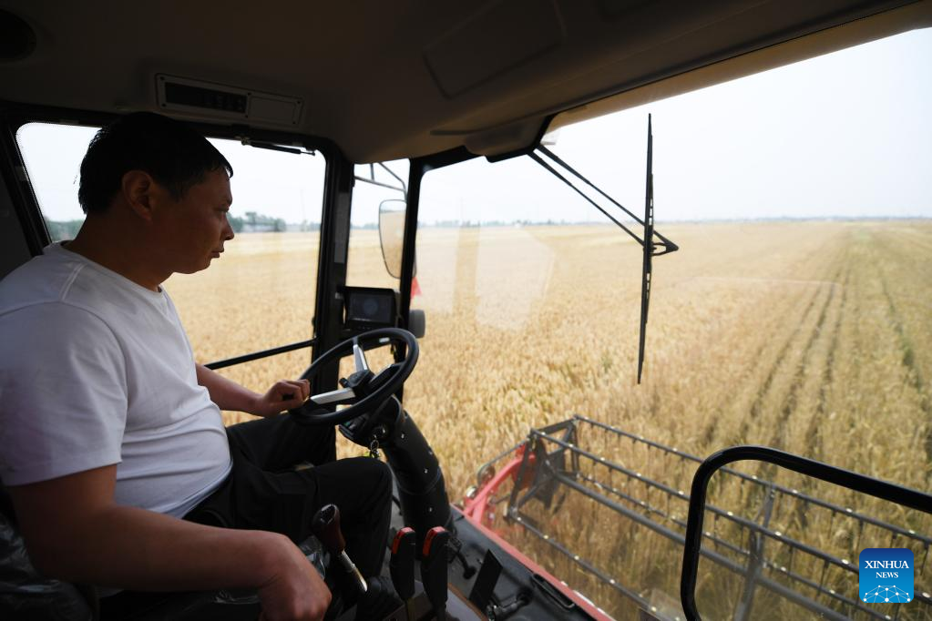 Technician Hu Xiaoqiang operates a harvester in the wheat field in Huyang Town of Tanghe County, Nanyang City, central China's Henan Province, May 22, 2022. Farmers in south Henan are now preoccupied with agricultural businesses as summer harvest hits full swing. (Xinhua/Zhang Haoran)