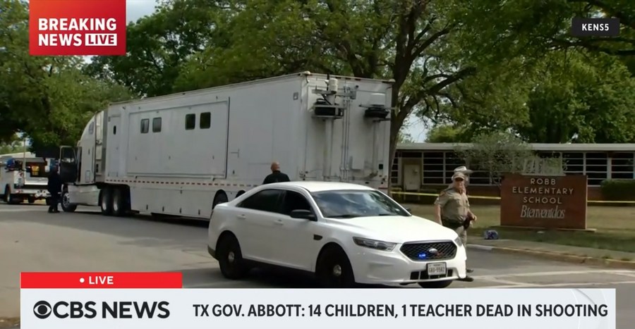 The screenshot taken from the live streaming of CBS News shows staff members and vehicles in front of the Robb Elementary School in Uvalde, Texas, where a gunman killed 14 children and a teacher on May 24, 2022. (Xinhua)