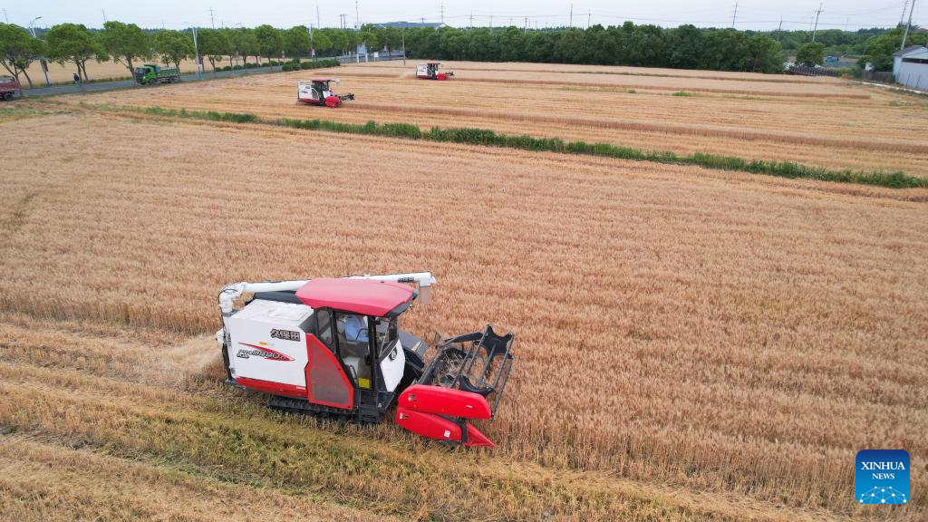 Aerial photo taken on May 23, 2022 shows farmers harvesting wheat in the fields in Yalu Village of Taicang, east China's Jiangsu Province. (Photo by Ji Haixin/Xinhua)
