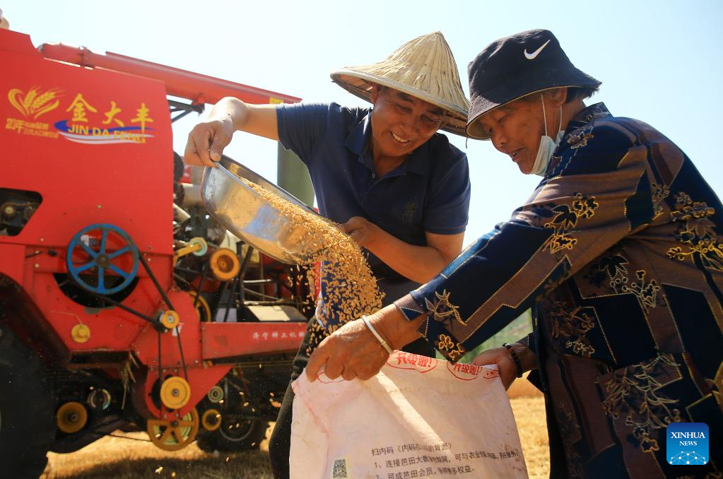 Farmers harvest wheat in the fields in Lieshan Township of Huaibei, east China's Anhui Province, May 23, 2022. (Photo by Wan Shanchao/Xinhua)