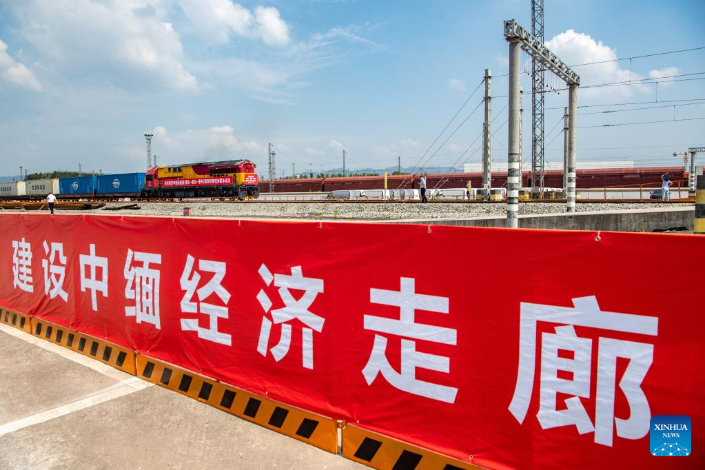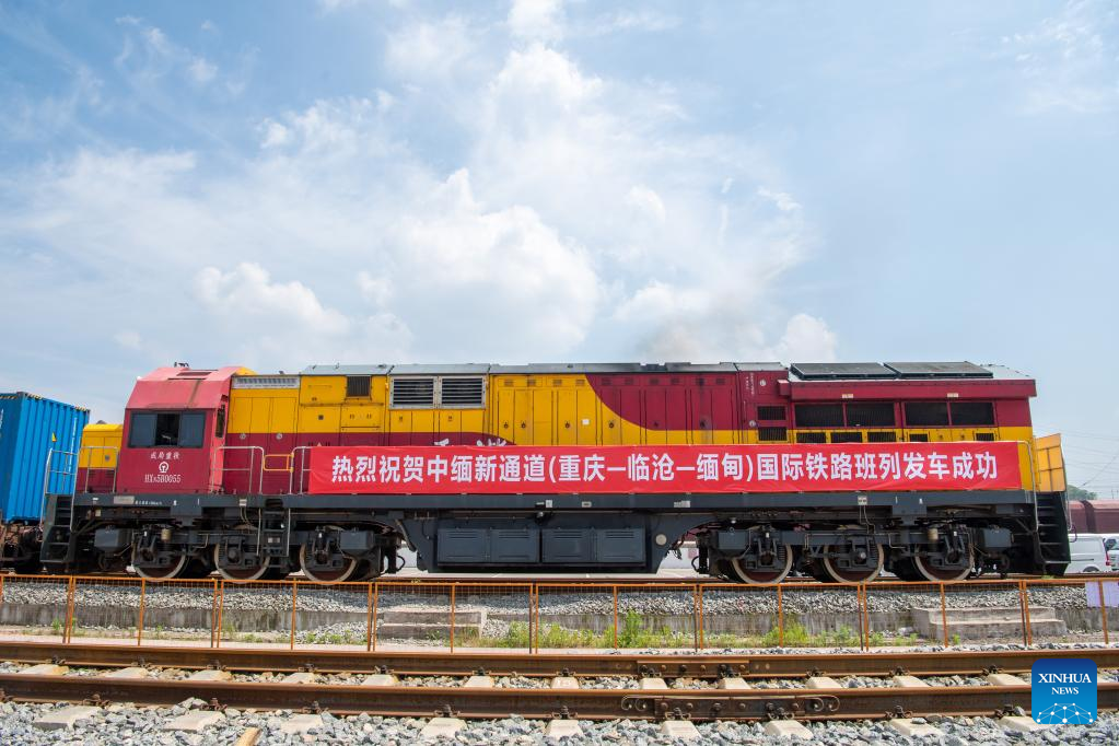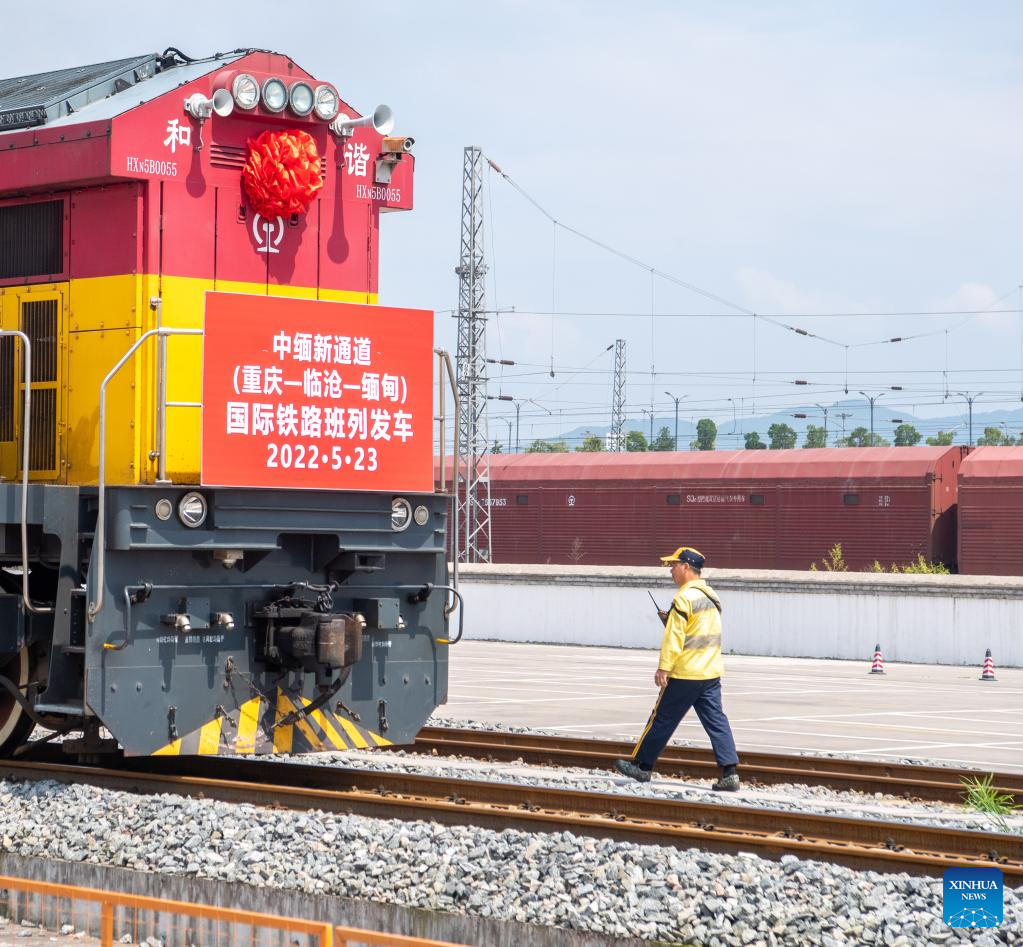 The first international freight train linking Chongqing and Lincang in southwest China with Myanmar is about to set off from the Yuzui station in Chongqing, southwest China, on May 23, 2022. Carrying 60 twenty-foot equivalent units (TEU) of mechanical equipment, electronic and auto parts, the train will pass through Lincang in southwest China's Yunnan province and arrive at Myanmar's Mandalay in about 15 days. This new freight train route can save about 20 days compared with traditional logistics routes and reduce 20 percent of logistics cost. (Xinhua/Tang Yi)