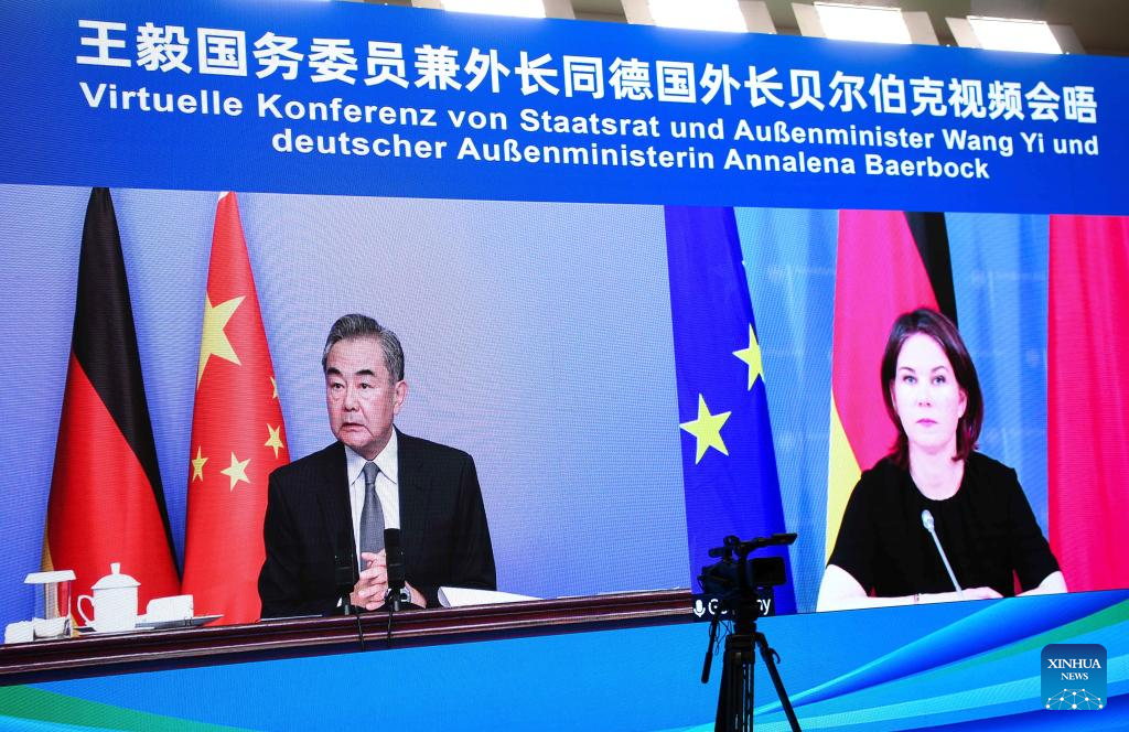 GUANGZHOU, May 24 (Xinhua) -- Chinese State Councilor and Foreign Minister Wang Yi and German Foreign Minister Annalena Baerbock held a video meeting on Tuesday, exchanging views on furthering bilateral ties and upholding true multilateralism, among other issues.