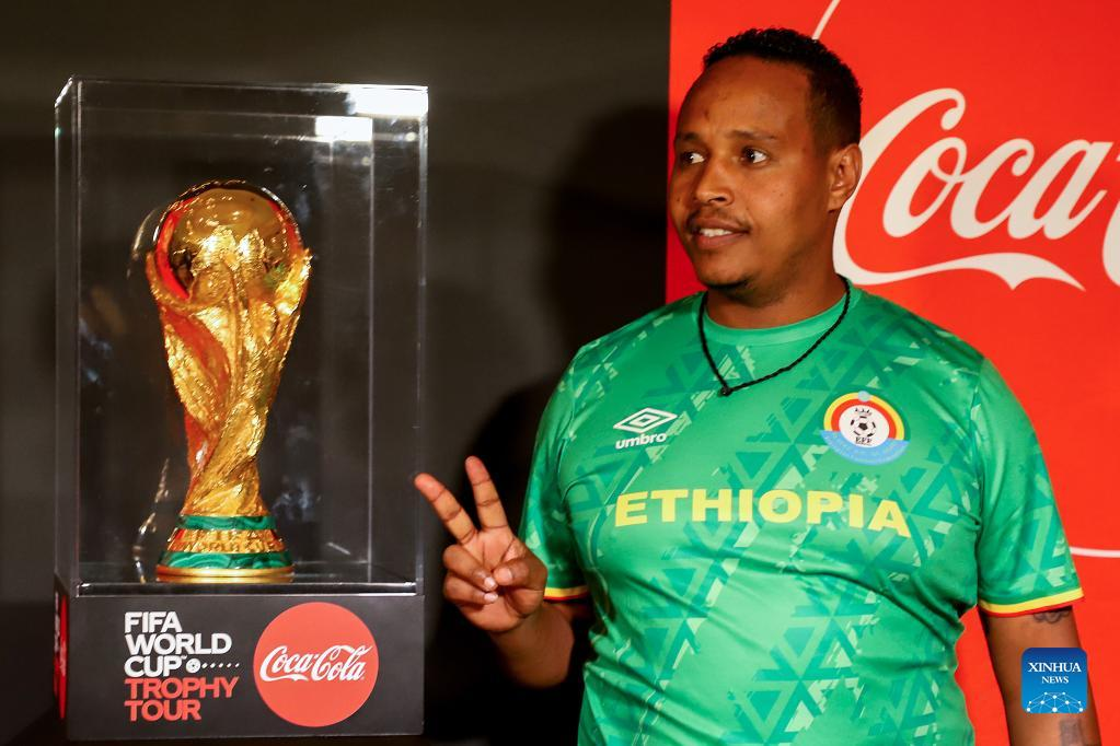 A man poses with the displayed trophy during the FIFA World Cup Trophy Tour event in Addis Ababa, Ethiopia, on May 24, 2022. (Xinhua/Michael Tewelde)