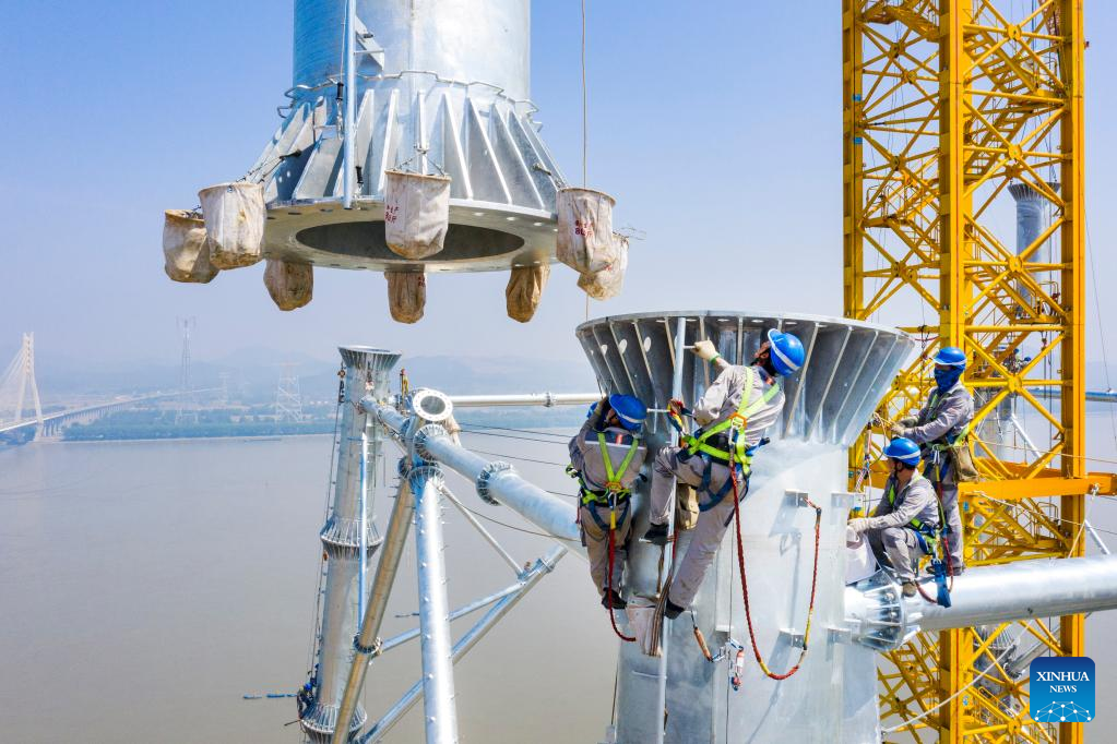 A utility technician works at the construction site of the Anhui section of Baihetan-Zhejiang ultra-high-voltage (UHV) power transmission project by the Yangtze River in Chizhou, east China's Anhui Province, May 25, 2022. (Photo by Zheng Xianlie/Xinhua)
