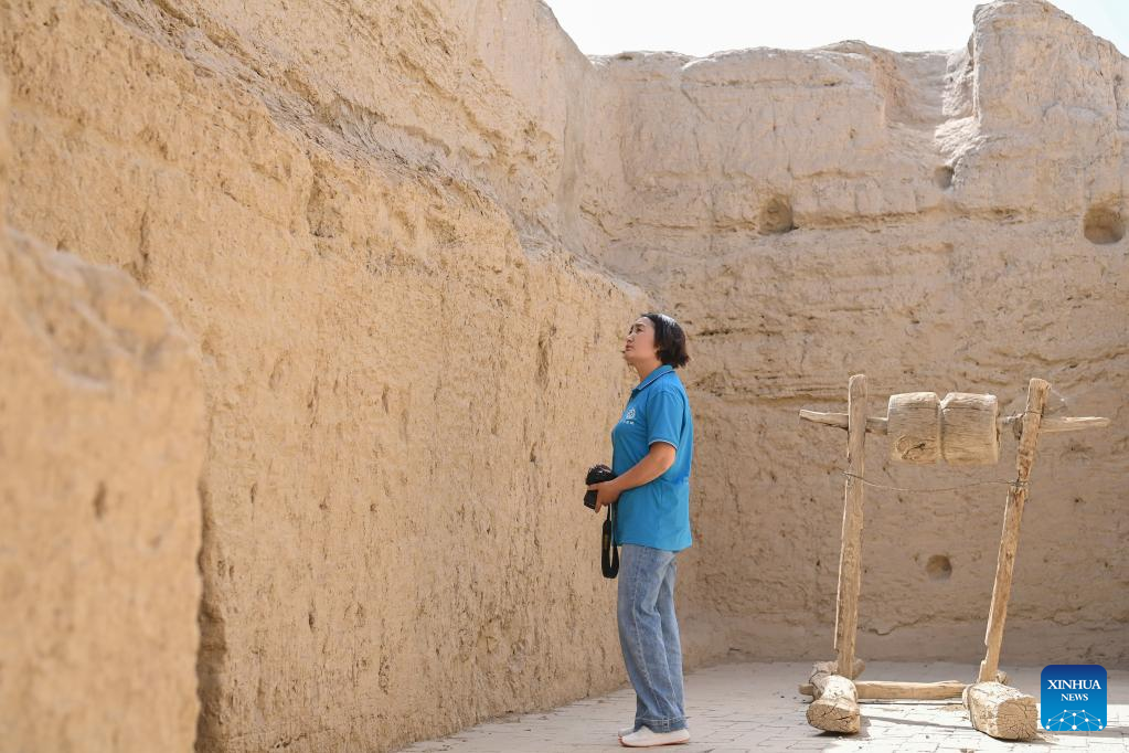 Gulibekge Maiming Reheman checks the impact of plants on the ancient wall at Jiaohe ancient city, Turpan, northwest China's Xinjiang Uygur Autonomous Region, May 20, 2022.
