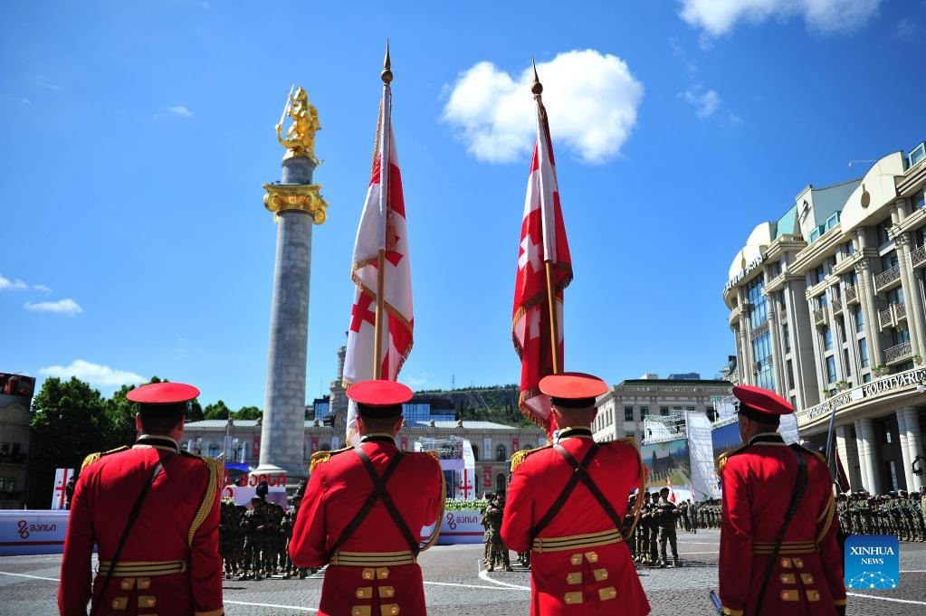 Georgian military personnel participate in the parade to celebrate Georgia's Independence Day at the Freedom Square in Tbilisi, capital of Georgia, on May 26, 2022. (Photo by Kulumbegashvili Tamuna/Xinhua)