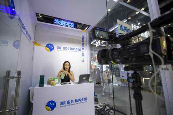 A livestream show is held at the exhibition booth of east China’s Zhejiang province at the 8th China International Fair for Trade in Services, Sept. 3, 2021. (People’s Daily Online/Yuan Chen)