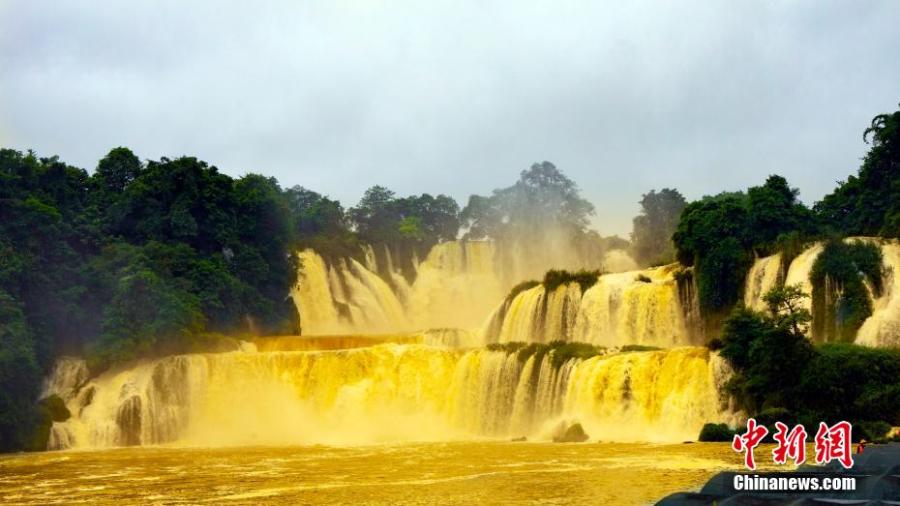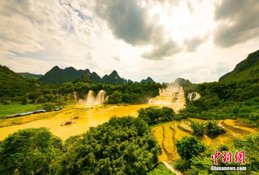 Detian waterfall forms a rare "golden waterfall" under the sun light due to the soared water volume. May 26, 2022. (Photo: China News Service/Yang Huwang)