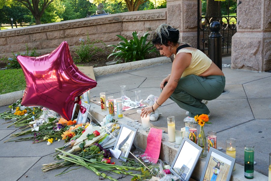 A woman places a candle for victims killed in the Uvalde school shooting in front of Texas Capitol building in Austin, Texas, the United States, May 26, 2022. (Photo by Bo Lee/Xinhua)