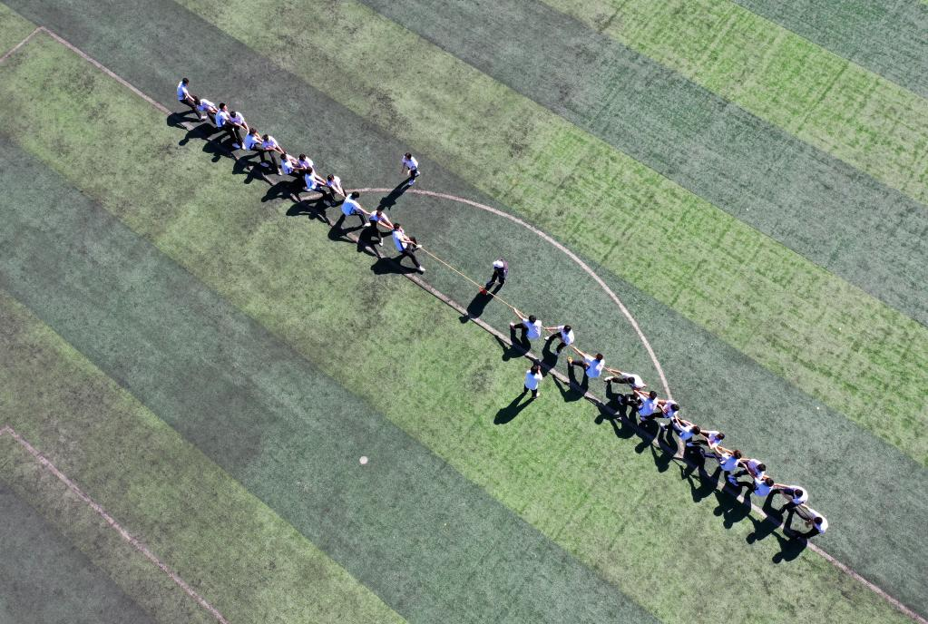 Aerial photo taken on May 27, 2022 shows the senior high school students taking part in a tug-of-war game at a high school in Jinzhou, north China's Hebei Province.