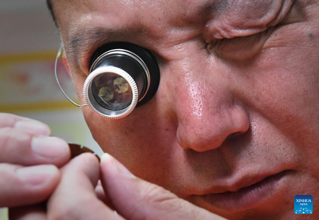 Cheng Yucai selects dyestuff at his workshop in Xinmi City, central China's Henan Province, on May 24, 2022. (Xinhua/Li An)