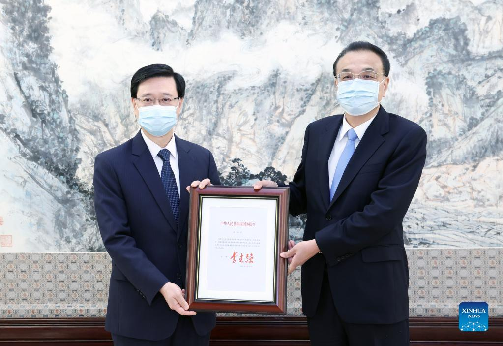 Premier Li Keqiang grants the official certificate of appointment to John Lee as the sixth-term chief executive of Hong Kong Special Administrative Region (HKSAR), in Beijing, capital of China, May 30, 2022. (Xinhua/Yao Dawei)