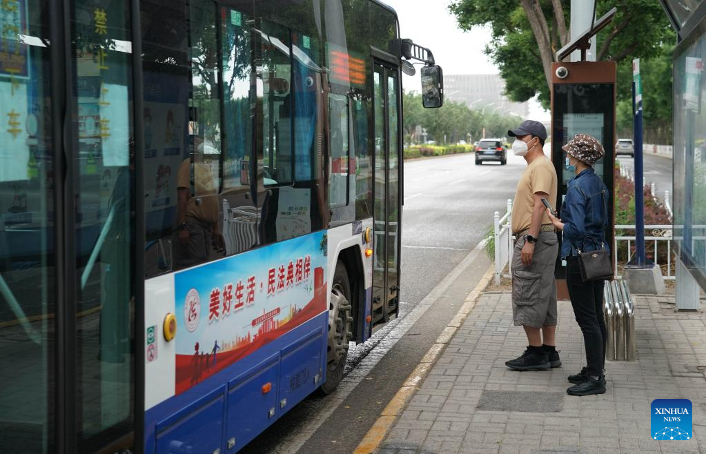 People are about to get on a bus at a bus station in Shunyi District of Beijing, capital of China, May 29, 2022. (Xinhua/Ren Chao)