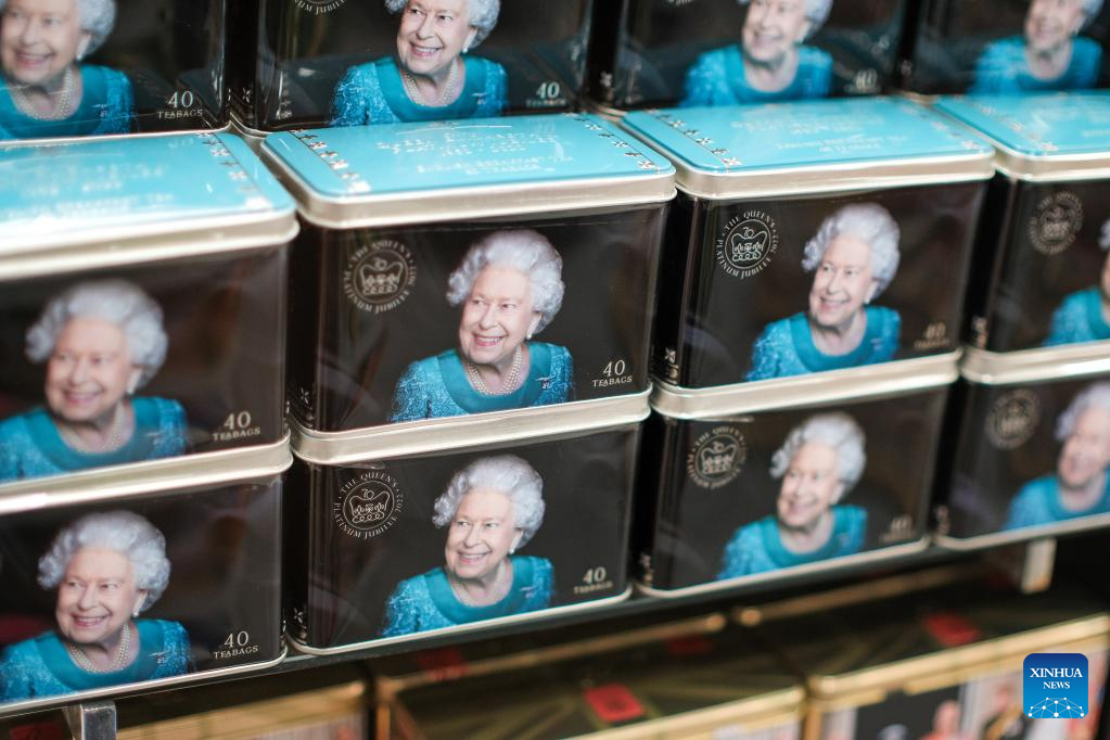 Photo taken on May 30, 2022 shows merchandise on sale near Piccadilly Circus in preparation for the Platinum Jubilee celebrations for Britain's Queen Elizabeth II in London, Britain. (Photo by Tim Ireland/Xinhua)