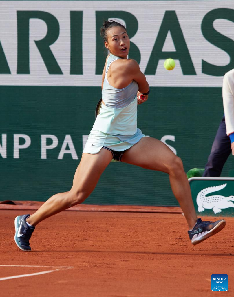 Zheng Qinwen returns a shot during the women's singles fourth round match between Zheng Qinwen of China and Iga Swiatek of Poland at the French Open tennis tournament at Roland Garros in Paris, France, on May 30, 2022. (Xinhua/Meng Dingbo)