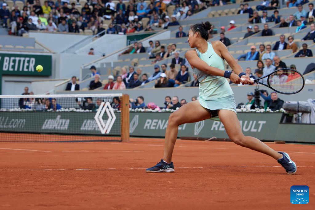Zheng Qinwen returns a shot during the women's singles fourth round match between Zheng Qinwen of China and Iga Swiatek of Poland at the French Open tennis tournament at Roland Garros in Paris, France, on May 30, 2022. (Xinhua/Meng Dingbo)