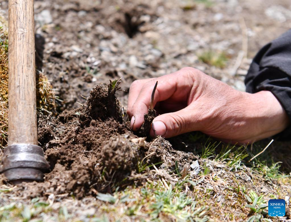 A caterpillar fungus sprouts on the grassland in Biru County of Nagqu, southwest China's Tibet Autonomous Region, May 25, 2022.