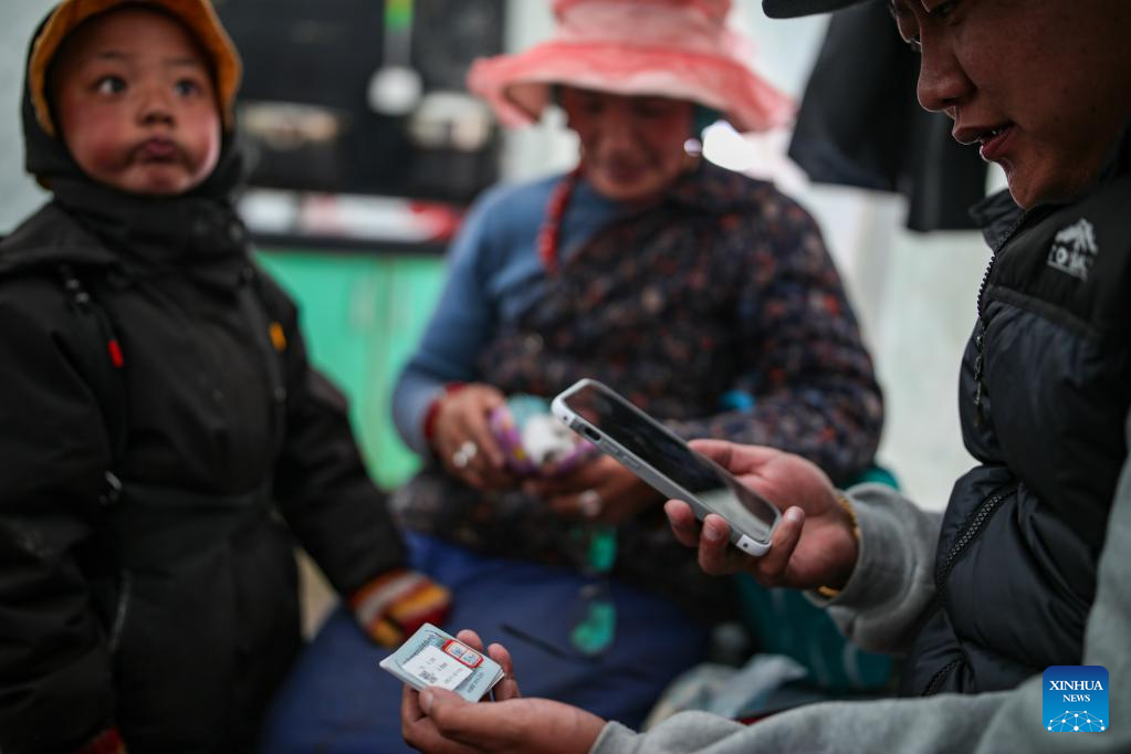 A staff member helps herdswoman Qime Garde register her newly-harvested caterpillar fungi for counting the total quantity at a caterpillar fungus collecting site in Lainqu Township, Biru County of Nagqu, southwest China's Tibet Autonomous Region, May 25, 2022.