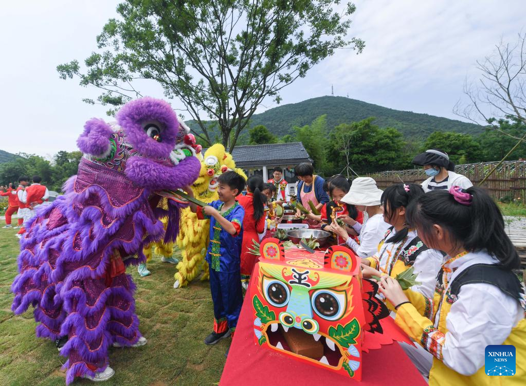 Children attend activities celebrating the upcoming Dragon Boat Festival at a farm in Huzhou City, east China's Zhejiang Province, May 31, 2022. The Dragon Boat Festival would fall on June 3 this year. (Xinhua/Xu Yu)