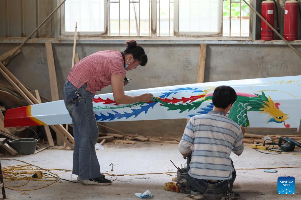 Painter Pan Shujian and his wife paint traditional patterns on a newly made dragon boat at Fanghegang dragon boat factory in Fangzhuang Village of Nantong Township in Minhou County of Fuzhou, southeast China's Fujian Province, May 30, 2022. Fangzhuang, known as "Dragon Boat Village", has a traditional dragon boat manufacturing history for more than 700 years. Every year, more than 200 hand-made wooden boats, carefully built by craftsmen, are sold nationwide and even overseas from the village. (Xinhua/Jiang Kehong)