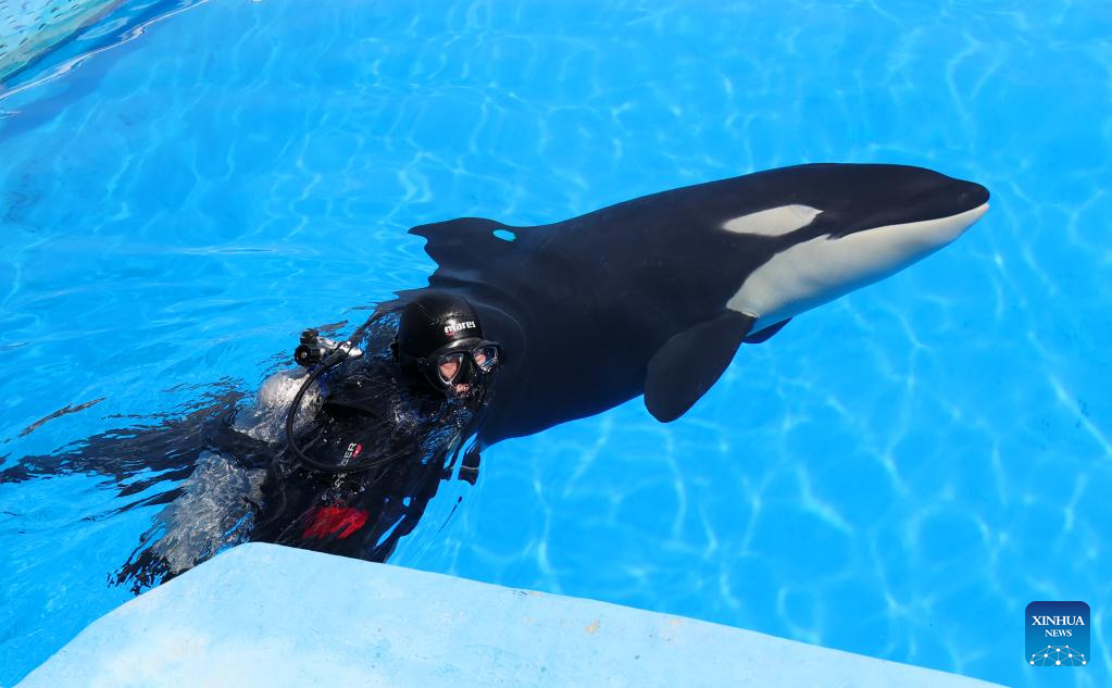 A staff member swims with a killer whale calf at the Shanghai Haichang Ocean Park in east China's Shanghai, May 31, 2022.