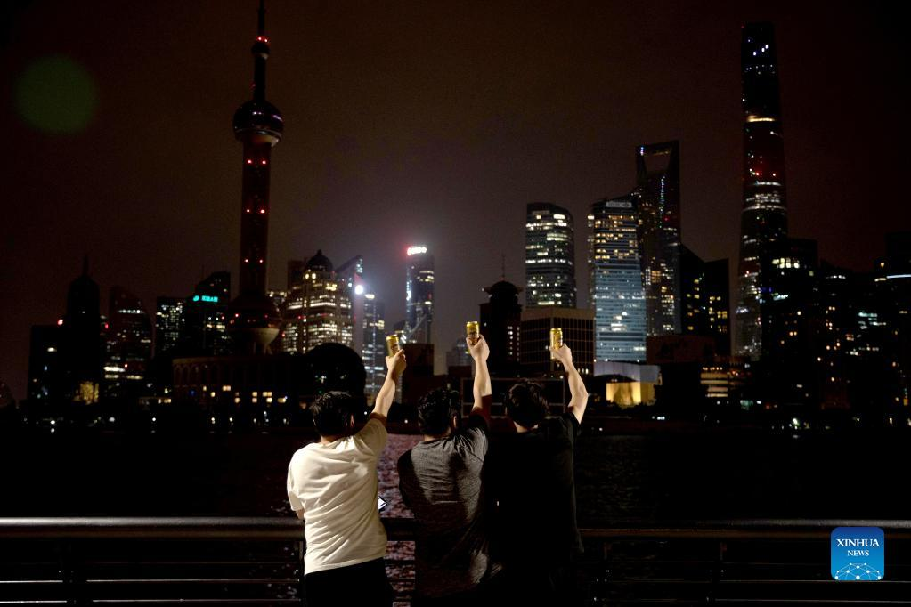 People cheer during the wee hours at the Bund in east China's Shanghai, June 1, 2022. (Xinhua/Jin Liwang)