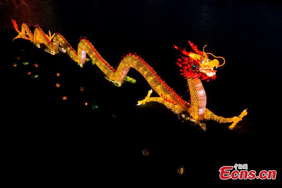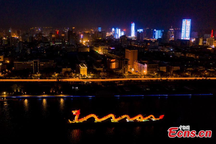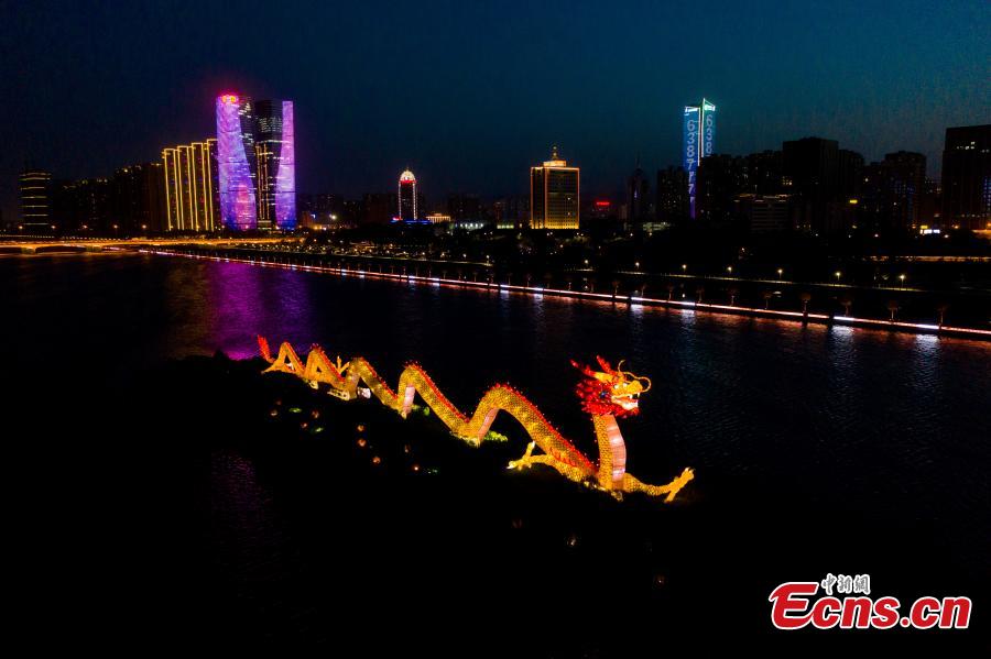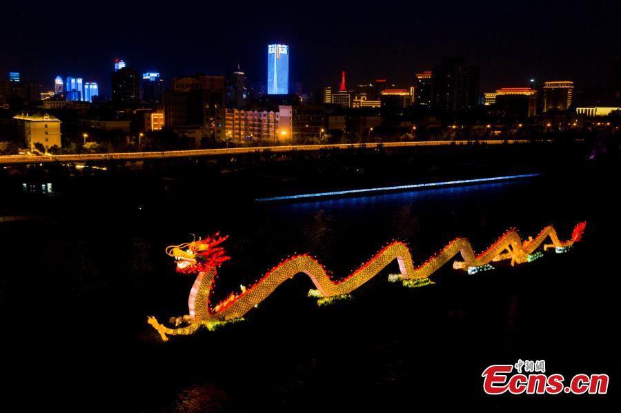 Huge dragon lantern lights up Fenhe River in Shanxi