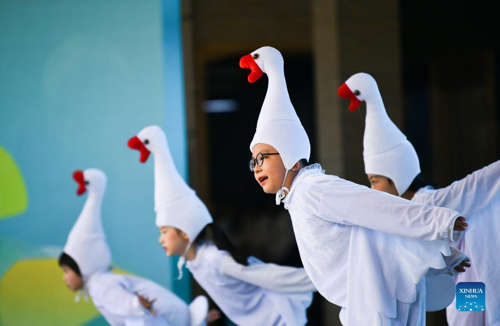 Children take part in a performance to celebrate the International Children's Day at Houzaimen primary school in Xincheng District of Xi'an, northwest China's Shaanxi Province, June 1, 2022. (Xinhua/Zhang Bowen)