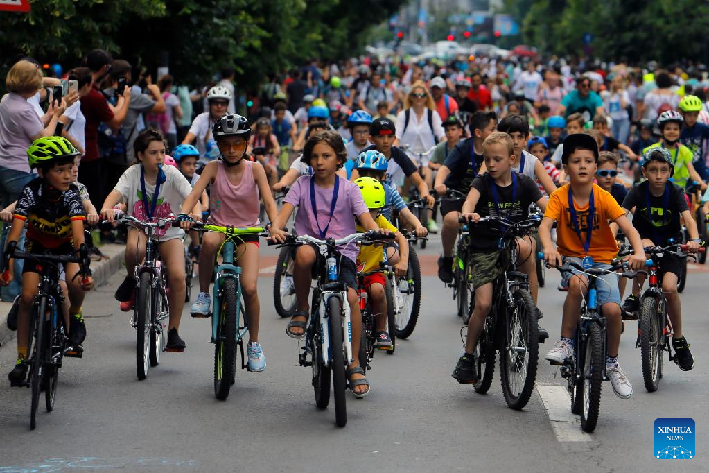 Children participate in a parade of little cyclists during an event marking International Children's Day in Bucharest, Romania, on June 1, 2022. (Photo by Cristian Cristel/Xinhua)