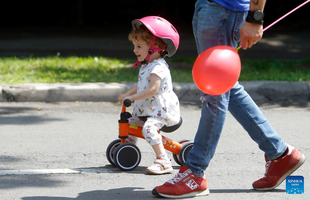 A child participates in a parade of little cyclists during an event marking International Children's Day in Bucharest, Romania, on June 1, 2022. (Photo by Cristian Cristel/Xinhua)