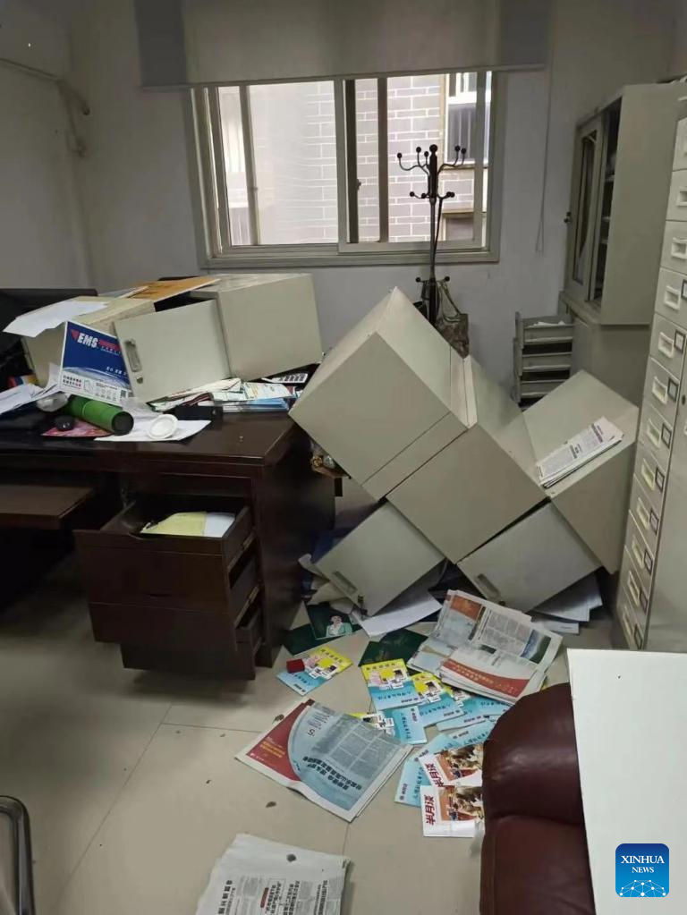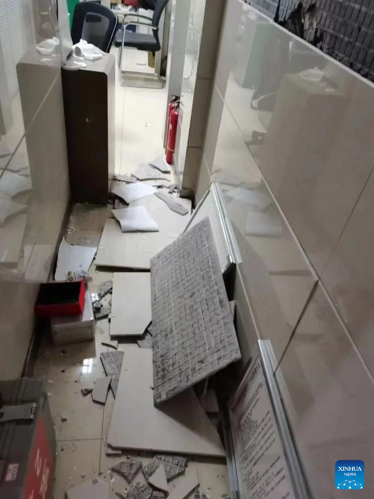 Photo taken on June 1, 2022 shows a view inside a damaged post office after an earthquake in Baoxing County of Ya'an, southwest China's Sichuan Province. Four people have been confirmed dead and 14 others are injured after an earthquake jolted the city of Ya'an in southwest China's Sichuan Province on Wednesday afternoon, according to the city's earthquake relief headquarters. The four people who died were hit by falling rocks, while the injured have been sent to hospital for treatment. (Photo by Wang Yingfa/Xinhua)
